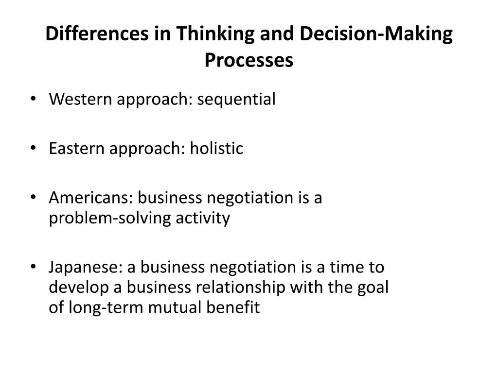 Differences in Thinking and Decision-Making Processes • Western approach: sequential • Eastern approach: holistic • Americans: business negotiation is a problem-solving activity • Japanese: a business negotiation is a time to develop a business relationship with the goal of long-term mutual benefit