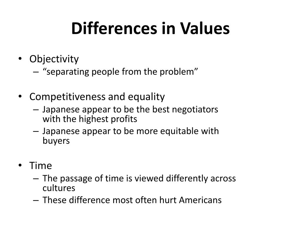 Differences in Values • Objectivity • “separating people from the problem” • Competitiveness and equality • Japanese appear to be the best negotiators with the highest profits • Japanese appear to be more equitable with buyers • Time • The passage of time is viewed differently across cultures • These difference most often hurt Americans
