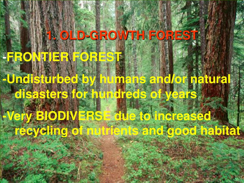 1. OLD-GROWTH FOREST -FRONTIER FOREST -Undisturbed by humans and/or natural disasters for hundreds of years -Very BIODIVERSE due to increased recycling of nutrients and good habitat