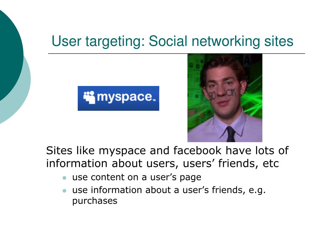 User targeting: Social networking sites Sites like myspace and facebookhave lots of information about users, users’ friends, etc • use content on a user’s page • use information about a user’s friends, e.g. purchases
