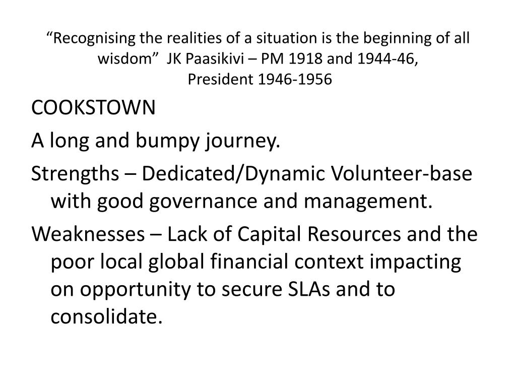 “Recognising the realities of a situation is the beginning of all wisdom” JK Paasikivi – PM 1918 and 1944-46, President 1946-1956 COOKSTOWN A long and bumpy journey. Strengths – Dedicated/Dynamic Volunteer-base with good governance and management. Weaknesses – Lack of Capital Resources and the poor local global financial context impacting on opportunity to secure SLAs and to consolidate.