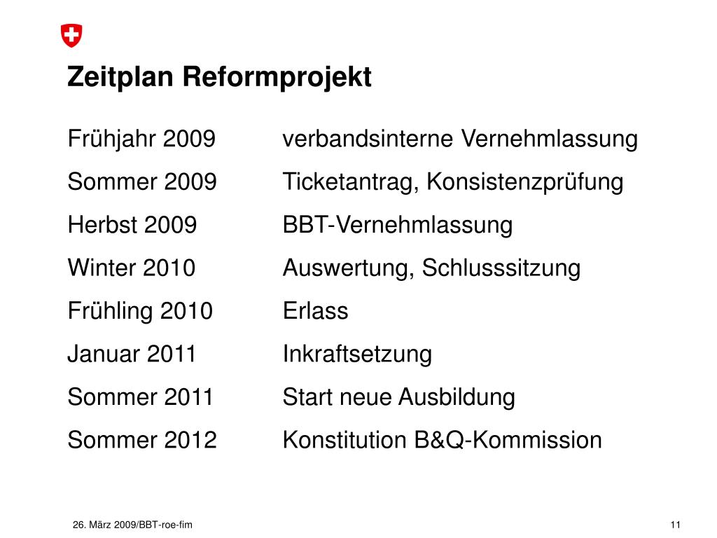 Zeitplan Reformprojekt Frühjahr 2009 verbandsinterne Vernehmlassung Sommer 2009 Ticketantrag, Konsistenzprüfung Herbst 2009 BBT-Vernehmlassung Winter 2010 Auswertung, Schlusssitzung Frühling 2010 Erlass Januar 2011 Inkraftsetzung Sommer 2011 Start neue Ausbildung Sommer 2012 Konstitution B&Q-Kommission 26. März 2009/BBT-roe-fim