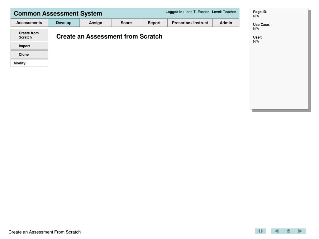 Common Assessment System Logged In: Jane T. Eacher Level: Teacher Page ID: N/A Use Case: N/A User: N/A Assessments Develop Assign Score Report Prescribe / Instruct Admin Create from Scratch Create an Assessment from Scratch Import Clone Modify: Create an Assessment From Scratch