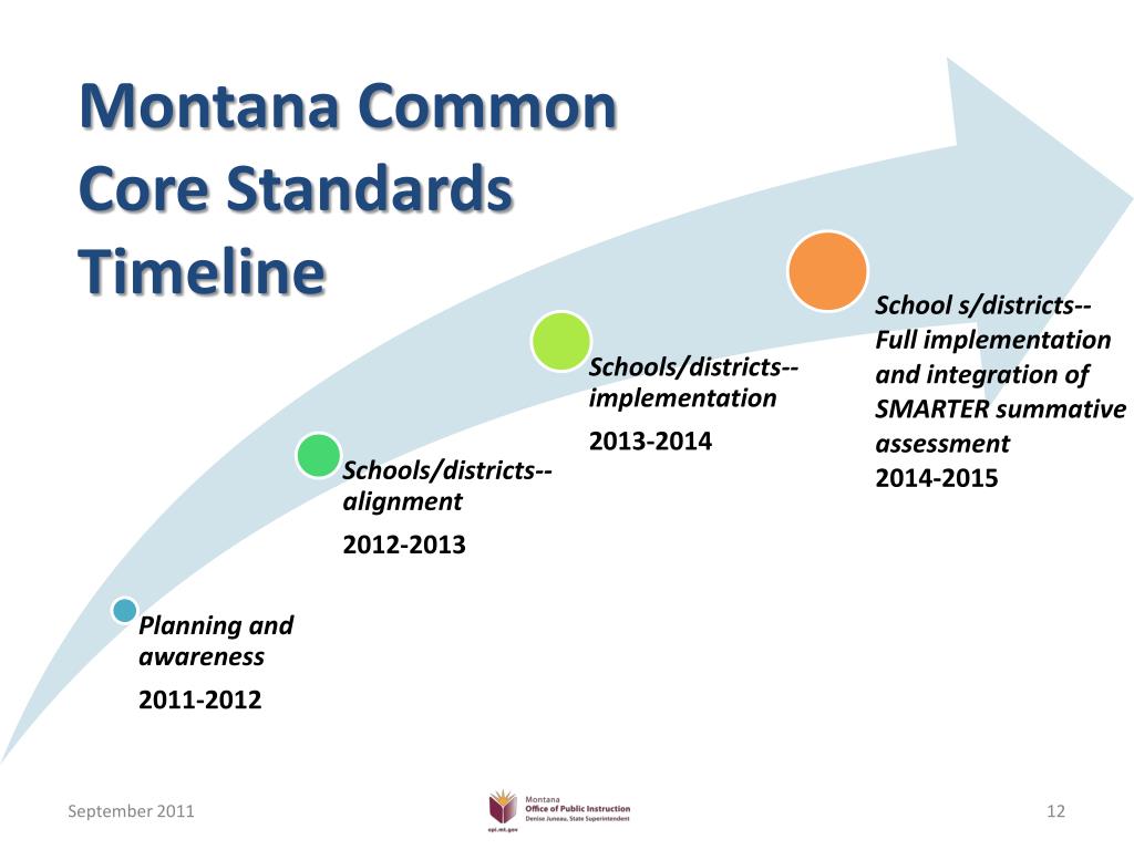 Common Core State Standards Initiative (CCSSI) Led by the Council of Chief State School Officers and the National Governors Association May 2009, State Superintendent Juneau and Governor Schweitzer signed a Memorandum of Agreement Montana involved educators from across the state in a thoughtful process
