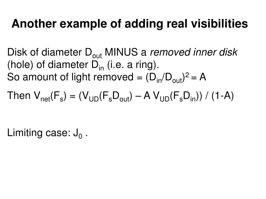 Another example of adding real visibilities Disk of diameter Dout MINUS a removed inner disk (hole) of diameter Din (i.e. a ring).So amount of light removed = (Din/Dout)2 = A Then Vnet(Fs) = (VUD(FsDout) – A VUD(FsDin)) / (1-A) Limiting case: J0 .