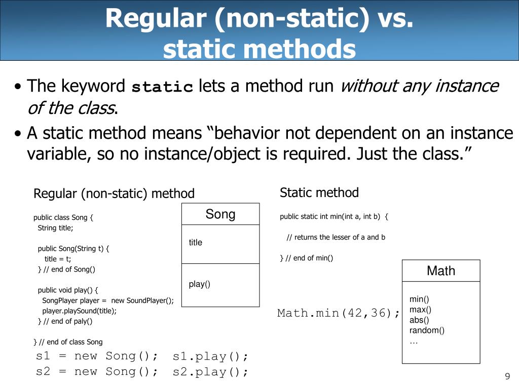 Regular (non-static) vs. static methods • The keyword static lets a method run without any instance of the class. • A static method means “behavior not dependent on an instance variable, so no instance/object is required. Just the class.” • Static method • public static int min(int a, int b) { • // returns the lesser of a and b • } // end of min() • Regular (non-static) method • public class Song { • String title; • public Song(String t) { • title = t; • } // end of Song() • public void play() { • SongPlayer player = new SoundPlayer(); • player.playSound(title); • } // end of paly() • } // end of class Song Song title play() Math min() max() abs() random() … Math.min(42,36); s1 = new Song(); s2 = new Song(); s1.play(); s2.play();