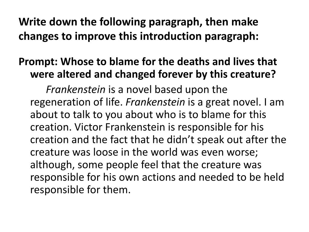 Write down the following paragraph, then make changes to improve this introduction paragraph: Prompt: Whose to blame for the deaths and lives that were altered and changed forever by this creature? Frankenstein is a novel based upon the regeneration of life. Frankenstein is a great novel. I am about to talk to you about who is to blame for this creation. Victor Frankenstein is responsible for his creation and the fact that he didn’t speak out after the creature was loose in the world was even worse; although, some people feel that the creature was responsible for his own actions and needed to be held responsible for them.