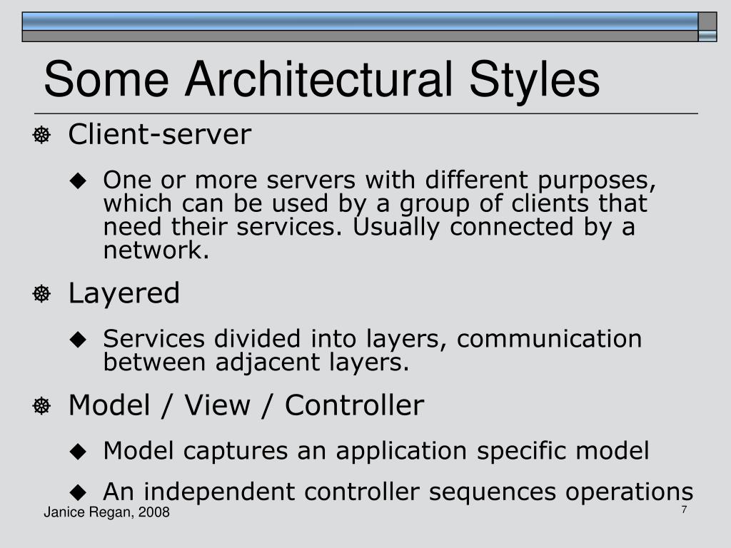 Some Architectural Styles • Client-server • One or more servers with different purposes, which can be used by a group of clients that need their services. Usually connected by a network. • Layered • Services divided into layers, communication between adjacent layers. • Model / View / Controller • Model captures an application specific model • An independent controller sequences operations