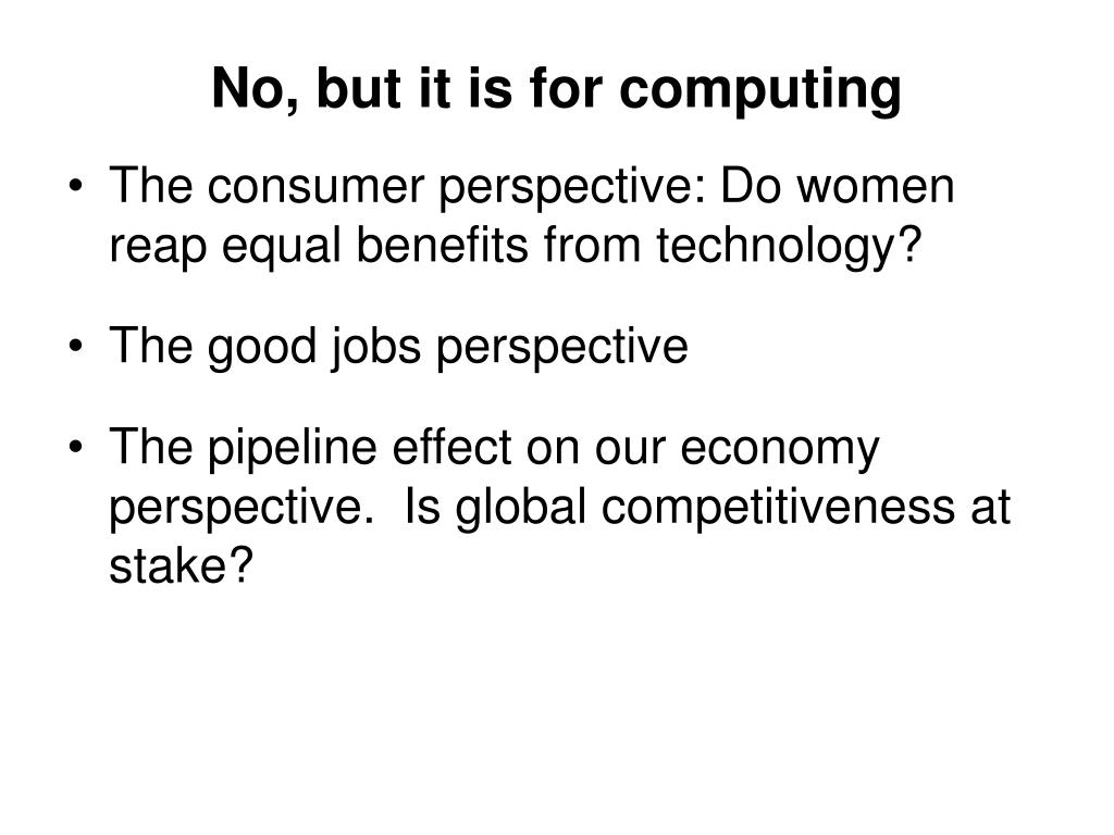 No, but it is for computing • The consumer perspective: Do women reap equal benefits from technology? • The good jobs perspective • The pipeline effect on our economy perspective. Is global competitiveness at stake?