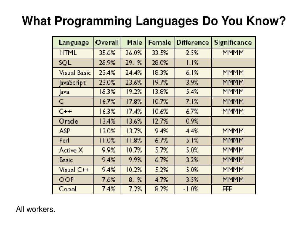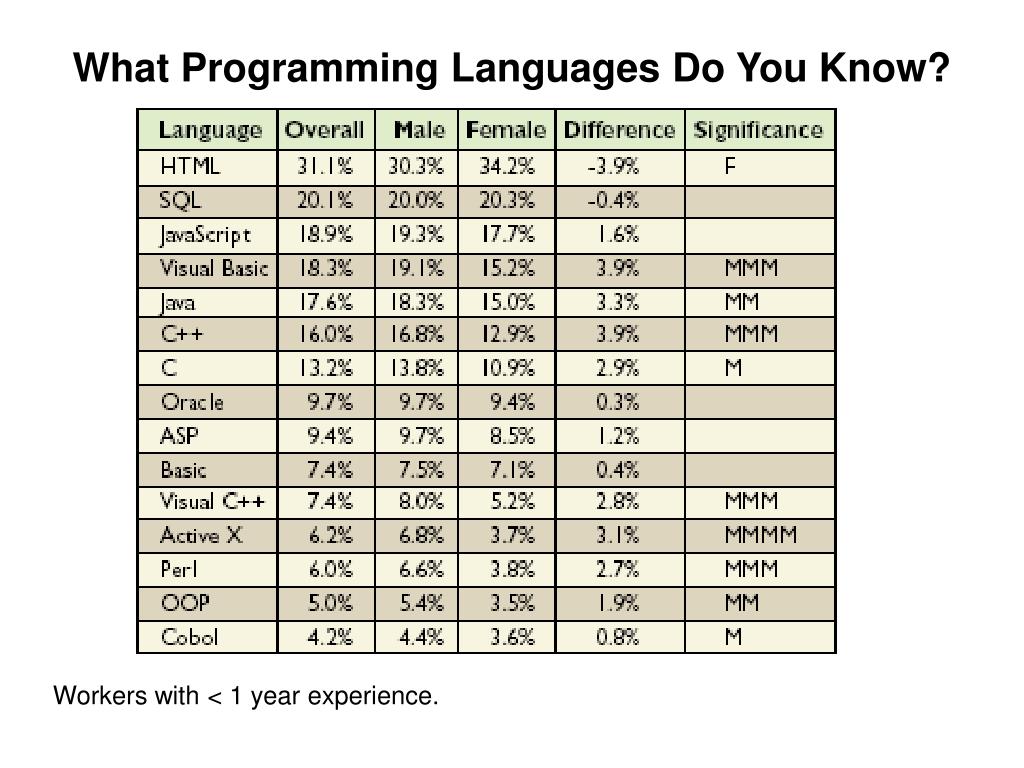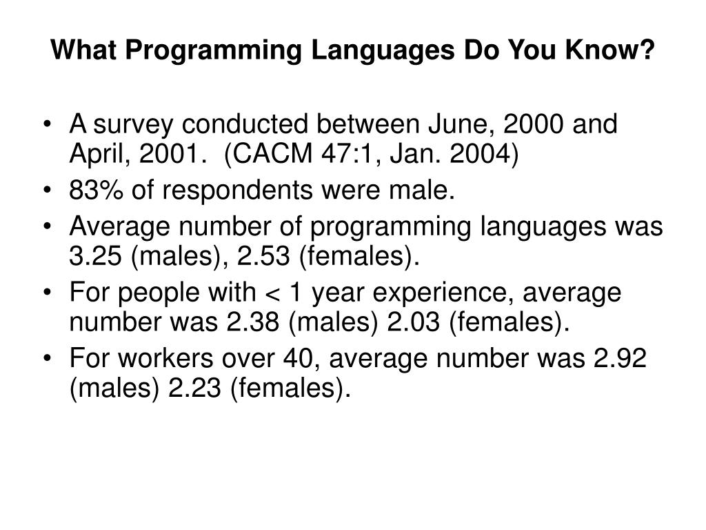 What Programming Languages Do You Know? • A survey conducted between June, 2000 and April, 2001. (CACM 47:1, Jan. 2004) • 83% of respondents were male. • Average number of programming languages was 3.25 (males), 2.53 (females). • For people with < 1 year experience, average number was 2.38 (males) 2.03 (females). • For workers over 40, average number was 2.92 (males) 2.23 (females).