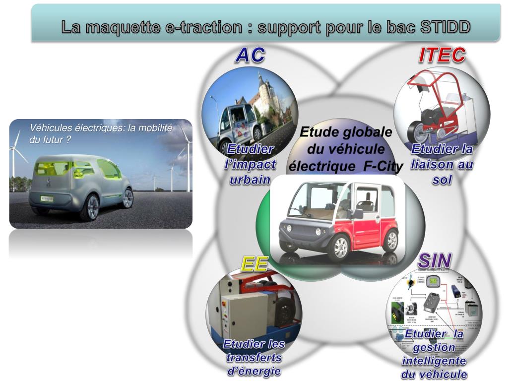 La maquette e-traction : support pour le bac STIDD. AC Etudier l’impact urbain. ITEC Etudier la liaison au sol. Véhicules électriques: la mobilité du futur ?. Etude globale du véhicule électrique F-City. EE Etudier les transferts d’énergie. SIN