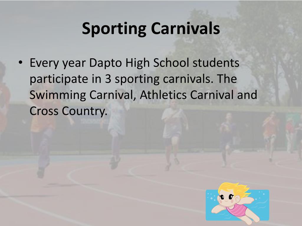 Sporting Carnivals • Every year Dapto High School students participate in 3 sporting carnivals. The Swimming Carnival, Athletics Carnival and Cross Country.