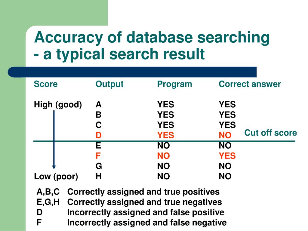 Accuracy of database searching - a typical search result Score Output Program Correct answer High (good) A YES YES B YES YES C YES YES D YES NO E NO NO F NO YES G NO NO Low (poor) H NO NO Cut off score A,B,C Correctly assigned and true positives E,G,H Correctly assigned and true negatives D Incorrectly assigned and false positive F Incorrectly assigned and false negative