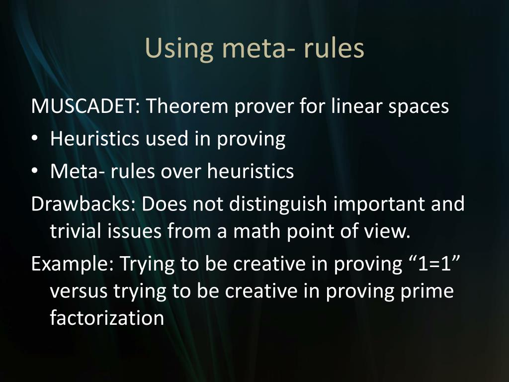 Using meta- rules MUSCADET: Theorem prover for linear spaces • Heuristics used in proving • Meta- rules over heuristics Drawbacks: Does not distinguish important and trivial issues from a math point of view. Example: Trying to be creative in proving “1=1” versus trying to be creative in proving prime factorization