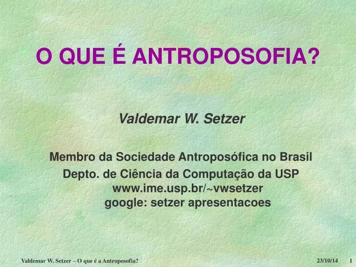 O QUE É ANTROPOSOFIA? Valdemar W. Setzer Membro da Sociedade Antroposófica no Brasil Depto. de Ciência da Computação da USPwww.ime.usp.br/~vwsetzergoogle: setzer apresentacoes Valdemar W. Setzer – O que é a Antroposofia?
