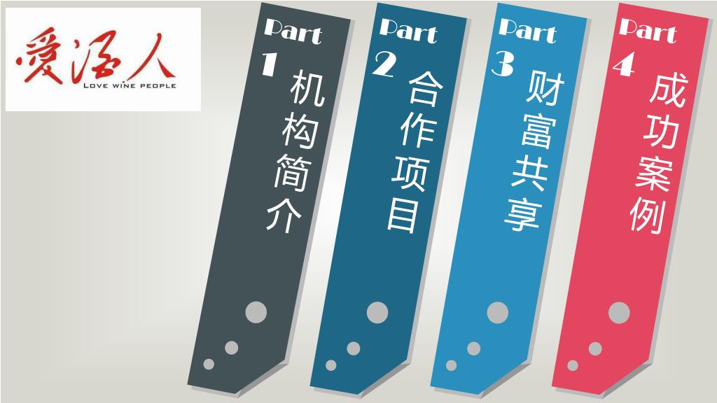 爱酒人俱乐部全国各地合作伙伴 业务共享方案. 互利共赢、财富共享. Part 2. Part 3. Part 4. Part 1. 机构简介. 合作项目. 财富共享. 成功案例. Part 1. 机构简介. 爱酒人俱乐部( www.i9r.cn ),目前在中国 60 座城市拥有战略合作伙伴,是中国最专业的全球葡萄酒专业第三方服务机构。