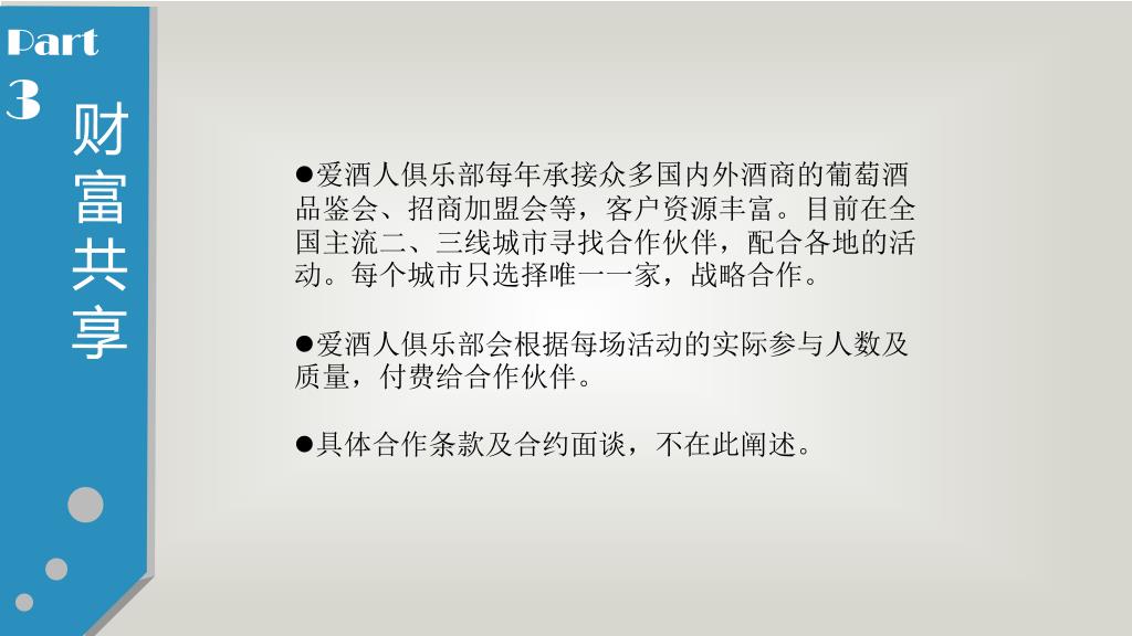 Part3 财富共享 • 爱酒人俱乐部每年承接众多国内外酒商的葡萄酒品鉴会、招商加盟会等,客户资源丰富。目前在全国主流二、三线城市寻找合作伙伴,配合各地的活动。每个城市只选择唯一一家,战略合作。 • 爱酒人俱乐部会根据每场活动的实际参与人数及质量,付费给合作伙伴。 • 具体合作条款及合约面谈,不在此阐述。