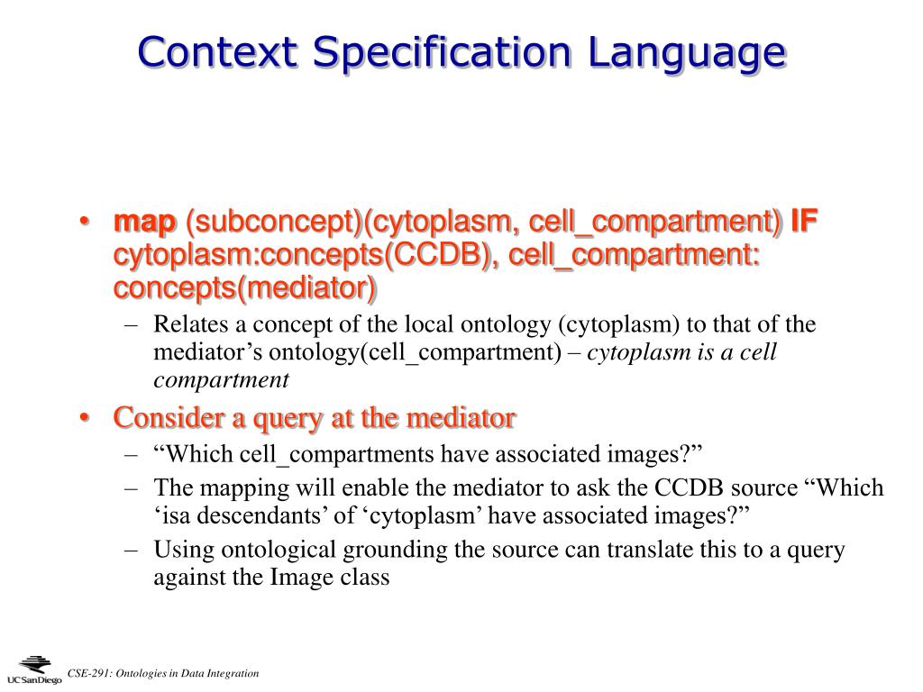 Context Specification Language • map (subconcept)(cytoplasm, cell_compartment) IF cytoplasm:concepts(CCDB), cell_compartment: concepts(mediator) • Relates a concept of the local ontology (cytoplasm) to that of the mediator’s ontology(cell_compartment) – cytoplasm is a cell compartment • Consider a query at the mediator • “Which cell_compartments have associated images?” • The mapping will enable the mediator to ask the CCDB source “Which ‘isa descendants’ of ‘cytoplasm’ have associated images?” • Using ontological grounding the source can translate this to a query against the Image class