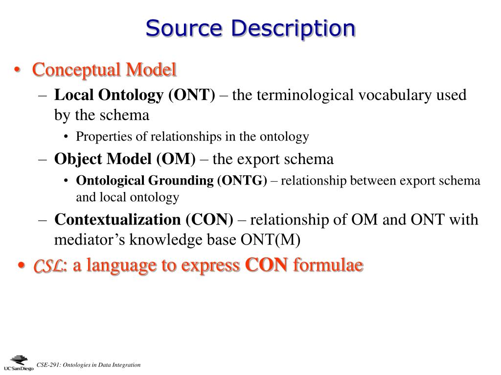 Source Description • Conceptual Model • Local Ontology (ONT) – the terminological vocabulary used by the schema • Properties of relationships in the ontology • Object Model (OM) – the export schema • Ontological Grounding (ONTG) – relationship between export schema and local ontology • Contextualization (CON) – relationship of OM and ONT with mediator’s knowledge base ONT(M) • CSL: a language to express CON formulae