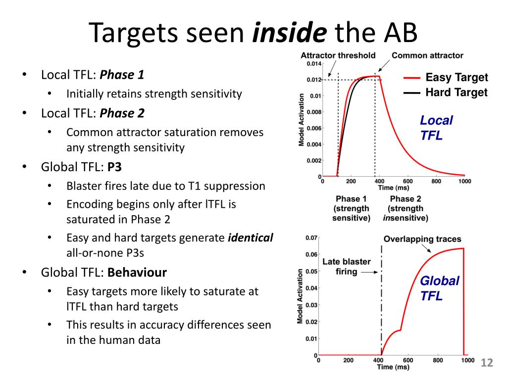 Targets seen outside the AB Easy Target • Local TFL: In Phase 1 • Target strength drives activation dynamics • Produces clear differences between easy and hard targets • Local TFL: In Phase 2 • Strength sensitivity gets carried over into Phase 2 • Global TFL: Contributes to the P3 • Blaster is available and fires early • gTFL inherits strength sensitivity • Hence easy targets evoke larger P3 • Behavioural Accuracy • Easy targets more likely to exceed encoding threshold • Hence generate higher accuracy Hard Target Local TFL Global TFL