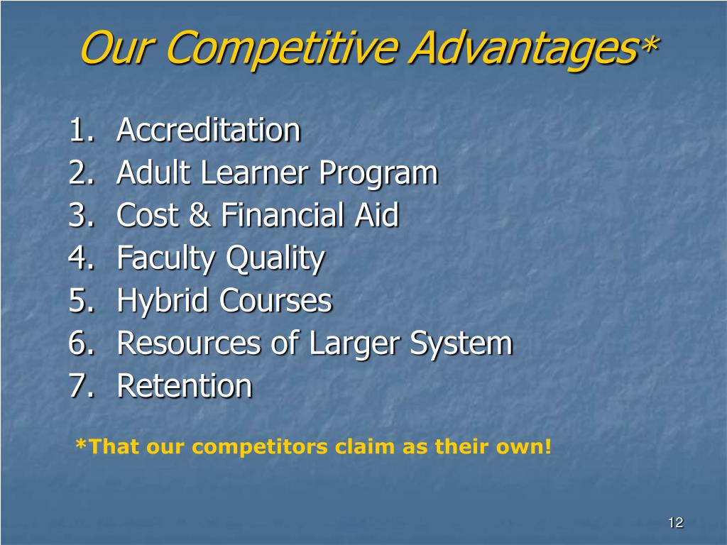 Our Competitive Advantages* • Accreditation • Adult Learner Program • Cost & Financial Aid • Faculty Quality • Hybrid Courses • Resources of Larger System • Retention *That our competitors claim as their own!