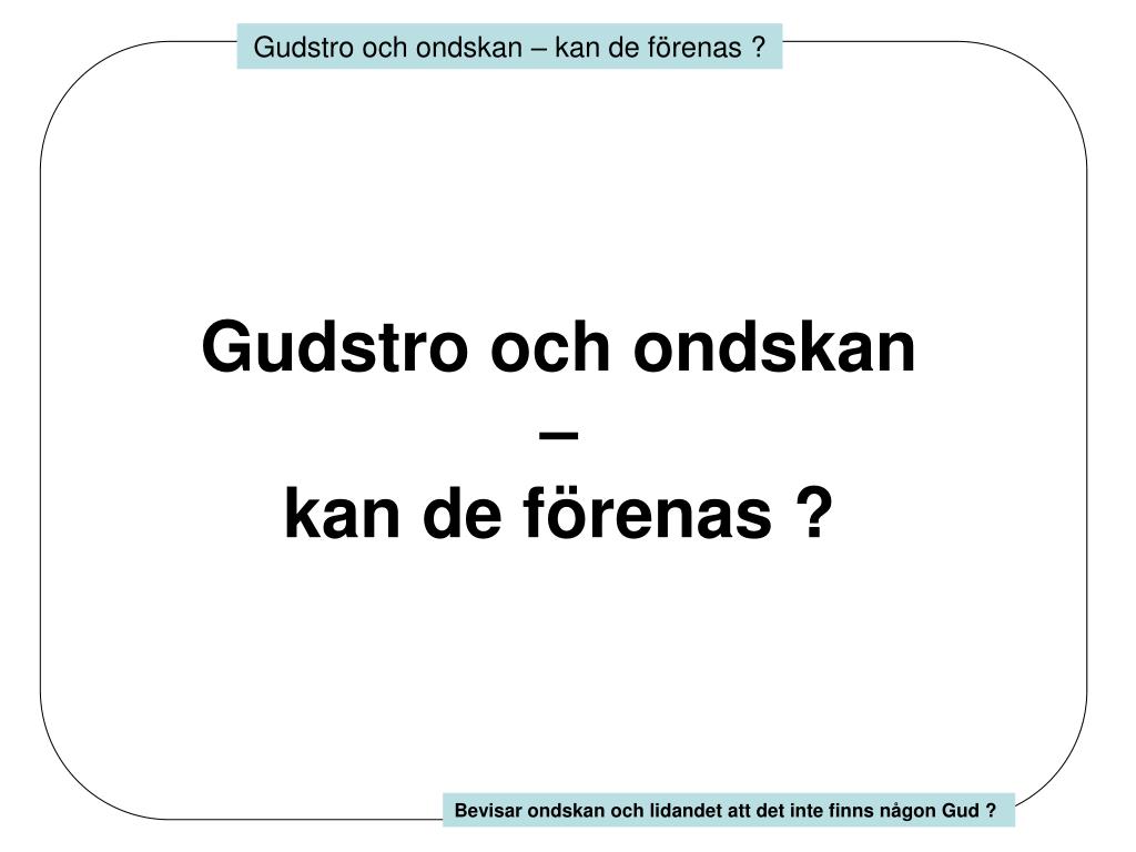 Gudstro och ondskan – kan de förenas ?. Gudstro och ondskan – kan de förenas ?. Bevisar ondskan och lidandet att det inte finns någon Gud ?. Gudstro och ondskan – kan de förenas ?.