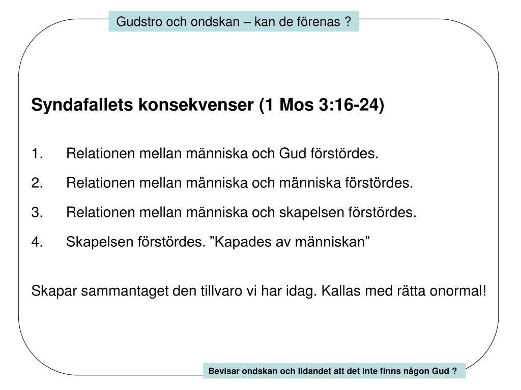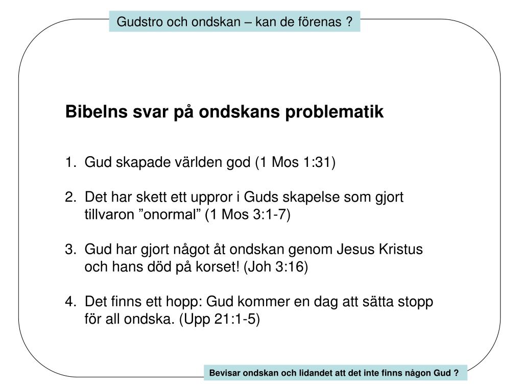 Gudstro och ondskan – kan de förenas ? • Bibelns svar på ondskans problematik • Gud skapade världen god (1 Mos 1:31) • Det har skett ett uppror i Guds skapelse som gjort tillvaron ”onormal” (1 Mos 3:1-7) • Gud har gjort något åt ondskan genom Jesus Kristus och hans död på korset! (Joh 3:16) • Det finns ett hopp: Gud kommer en dag att sätta stopp för all ondska. (Upp 21:1-5) Bevisar ondskan och lidandet att det inte finns någon Gud ?