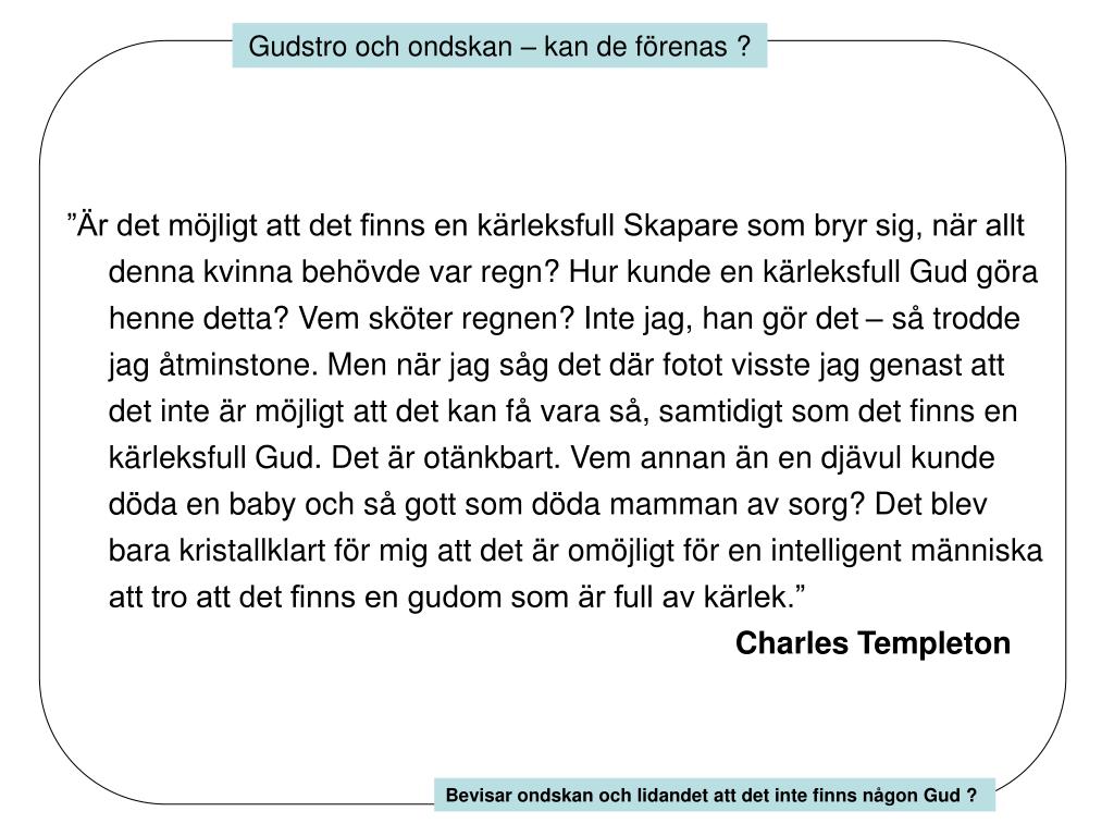 Gudstro och ondskan – kan de förenas ? ”Är det möjligt att det finns en kärleksfull Skapare som bryr sig, när allt denna kvinna behövde var regn? Hur kunde en kärleksfull Gud göra henne detta? Vem sköter regnen? Inte jag, han gör det – så trodde jag åtminstone. Men när jag såg det där fotot visste jag genast att det inte är möjligt att det kan få vara så, samtidigt som det finns en kärleksfull Gud. Det är otänkbart. Vem annan än en djävul kunde döda en baby och så gott som döda mamman av sorg? Det blev bara kristallklart för mig att det är omöjligt för en intelligent människa att tro att det finns en gudom som är full av kärlek.” Charles Templeton Bevisar ondskan och lidandet att det inte finns någon Gud ?