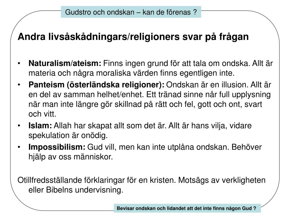 Gudstro och ondskan – kan de förenas ? Andra livsåskådningars/religioners svar på frågan • Naturalism/ateism: Finns ingen grund för att tala om ondska. Allt är materia och några moraliska värden finns egentligen inte. • Panteism (österländska religioner): Ondskan är en illusion. Allt är en del av samman helhet/enhet. Ett tränad sinne når full upplysning när man inte längre gör skillnad på rätt och fel, gott och ont, svart och vitt. • Islam: Allah har skapat allt som det är. Allt är hans vilja, vidare spekulation är onödig. • Impossibilism: Gud vill, men kan inte utplåna ondskan. Behöver hjälp av oss människor. Otillfredsställande förklaringar för en kristen. Motsägs av verkligheten eller Bibelns undervisning. Bevisar ondskan och lidandet att det inte finns någon Gud ?