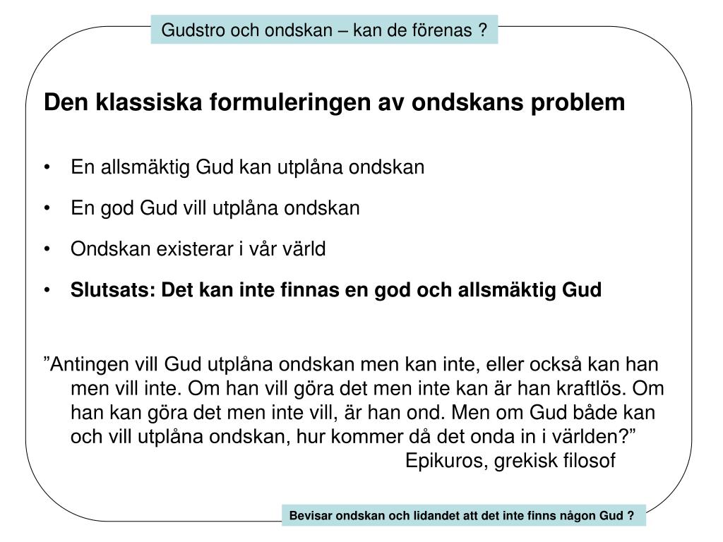 Gudstro och ondskan – kan de förenas ? Den klassiska formuleringen av ondskans problem • En allsmäktig Gud kan utplåna ondskan • En god Gud vill utplåna ondskan • Ondskan existerar i vår värld • Slutsats: Det kan inte finnas en god och allsmäktig Gud ”Antingen vill Gud utplåna ondskan men kan inte, eller också kan han men vill inte. Om han vill göra det men inte kan är han kraftlös. Om han kan göra det men inte vill, är han ond. Men om Gud både kan och vill utplåna ondskan, hur kommer då det onda in i världen?” Epikuros, grekisk filosof Bevisar ondskan och lidandet att det inte finns någon Gud ?