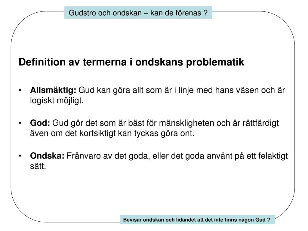 Gudstro och ondskan – kan de förenas ? Definition av termerna i ondskans problematik • Allsmäktig: Gud kan göra allt som är i linje med hans väsen och är logiskt möjligt. • God: Gud gör det som är bäst för mänskligheten och är rättfärdigt även om det kortsiktigt kan tyckas göra ont. • Ondska: Frånvaro av det goda, eller det goda använt på ett felaktigt sätt. Bevisar ondskan och lidandet att det inte finns någon Gud ?