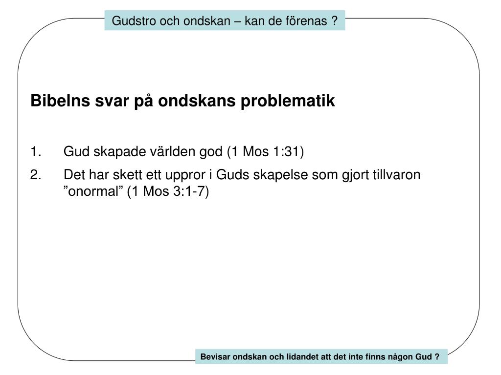 Gudstro och ondskan – kan de förenas ? Bibelns svar på ondskans problematik • Gud skapade världen god (1 Mos 1:31) • Det har skett ett uppror i Guds skapelse som gjort tillvaron ”onormal” (1 Mos 3:1-7) Bevisar ondskan och lidandet att det inte finns någon Gud ?