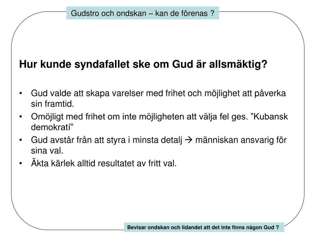 Gudstro och ondskan – kan de förenas ? Frågeställningar kring syndafallet • Hur kunde syndafallet ske om Gud är allsmäktig? • Är det inte orättvist att alla straffas för de första människornas synd? • Visste Gud att människan skulle falla och, i så fall, vad var det som gjorde att Gud ändå ansåg det vara värt att skapa? Bevisar ondskan och lidandet att det inte finns någon Gud ?