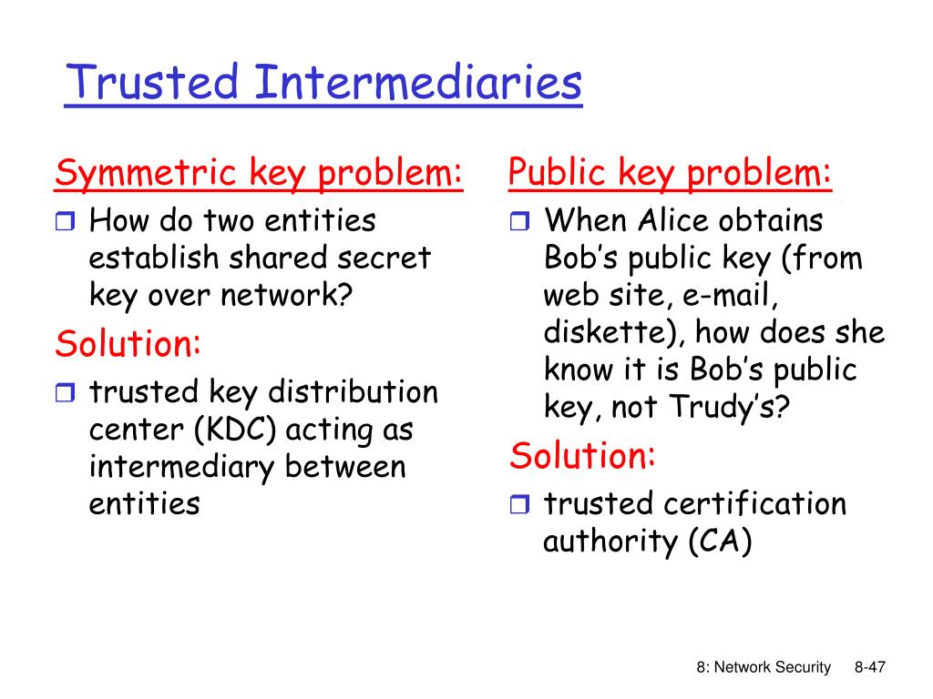 Symmetric key problem: How do two entities establish shared secret key over network? Solution: trusted key distribution center (KDC) acting as intermediary between entities Public key problem: When Alice obtains Bob’s public key (from web site, e-mail, diskette), how does she know it is Bob’s public key, not Trudy’s? Solution: trusted certification authority (CA) Trusted Intermediaries 8: Network Security