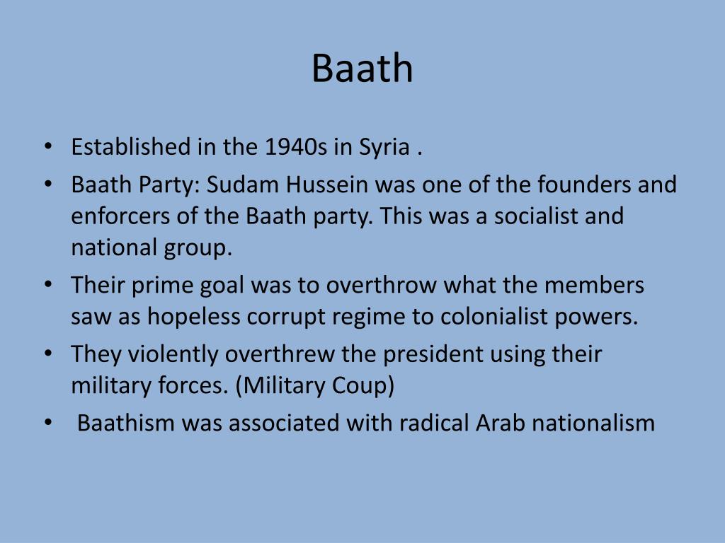 Baath • Established in the 1940s in Syria . • Baath Party: SudamHussein was one of the founders and enforcers of the Baath party. This was a socialist and national group. • Their prime goal was to overthrow what the members saw as hopeless corrupt regime to colonialist powers. • They violently overthrew the president using their military forces. (Military Coup) • Baathism was associated with radical Arab nationalism