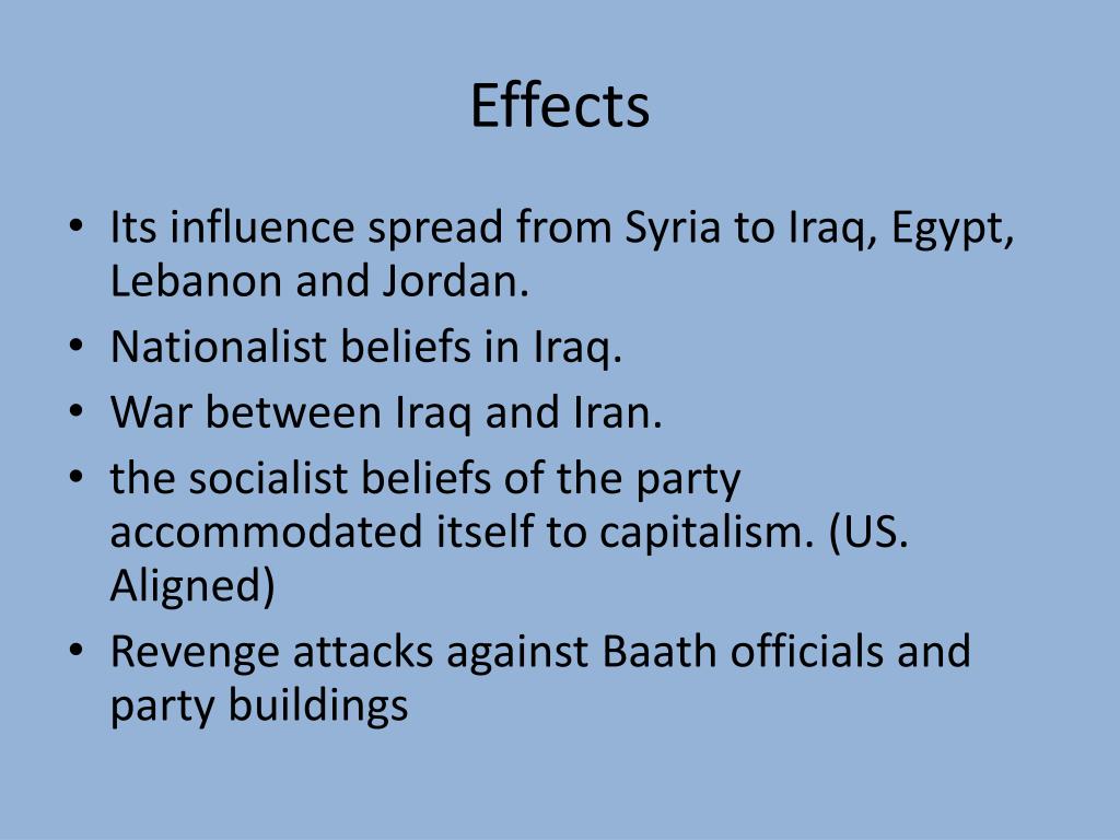 Effects • Its influence spread from Syria to Iraq, Egypt, Lebanon and Jordan. • Nationalist beliefs in Iraq. • War between Iraq and Iran. • the socialist beliefsof the party accommodated itself to capitalism. (US. Aligned) • Revenge attacks against Baath officials and party buildings