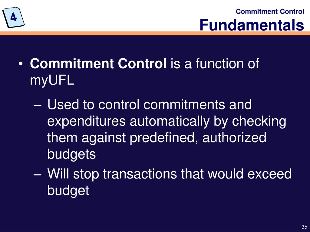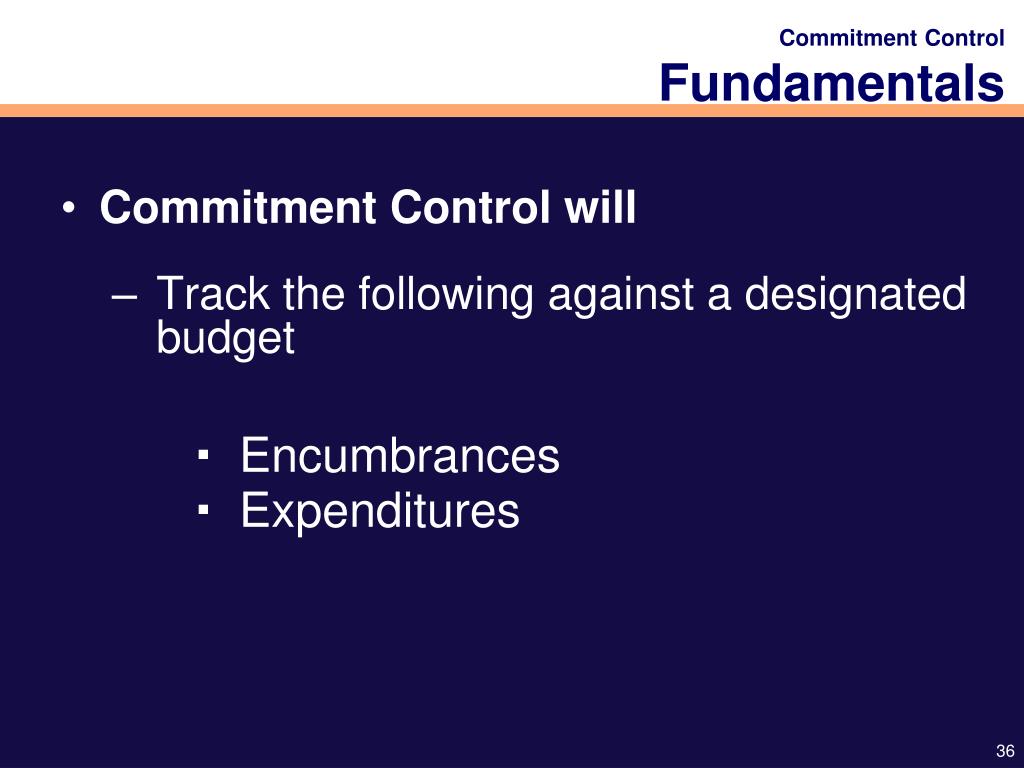 Commitment ControlFundamentals • Commitment Control will • Track the following against a designated budget • Encumbrances Expenditures