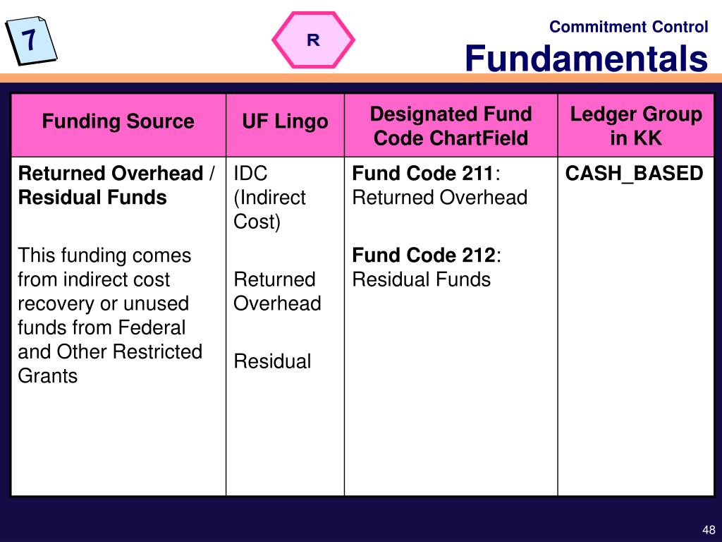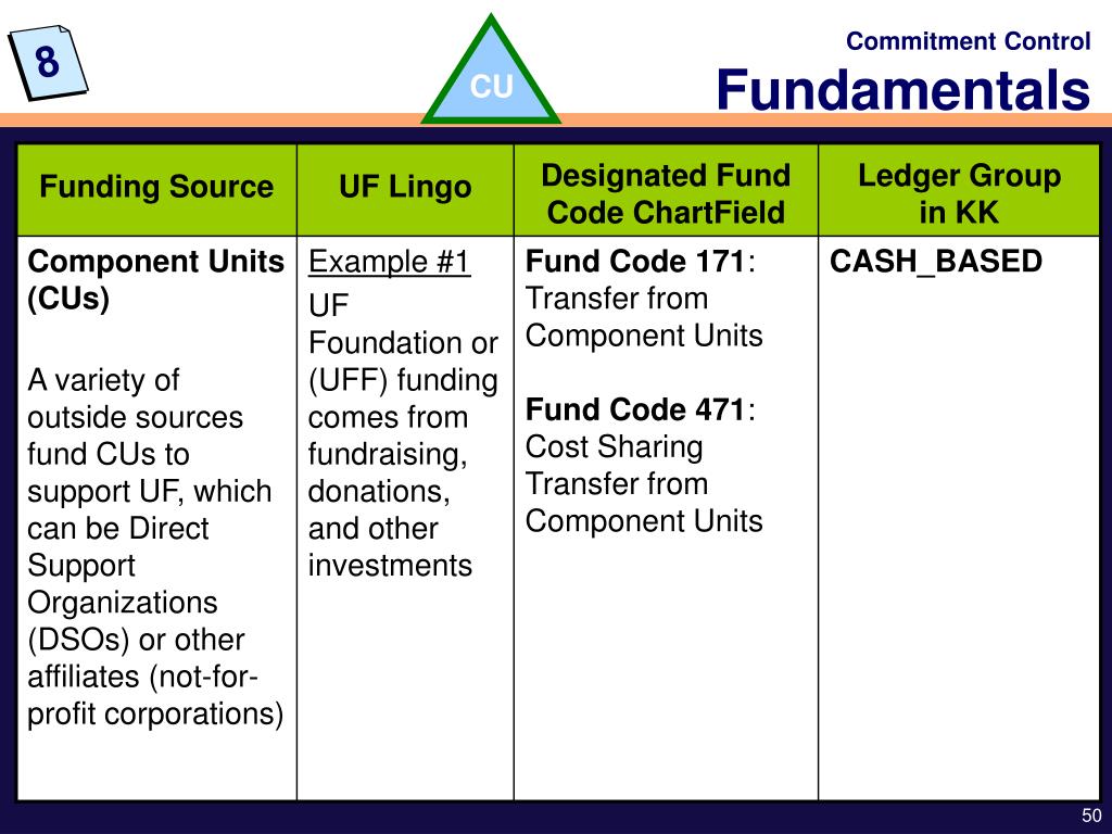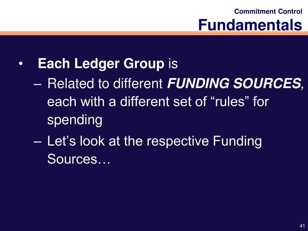 Commitment ControlFundamentals • Each Ledger Group is • Related to different FUNDING SOURCES, each with a different set of “rules” for spending • Let’s look at the respective Funding Sources…