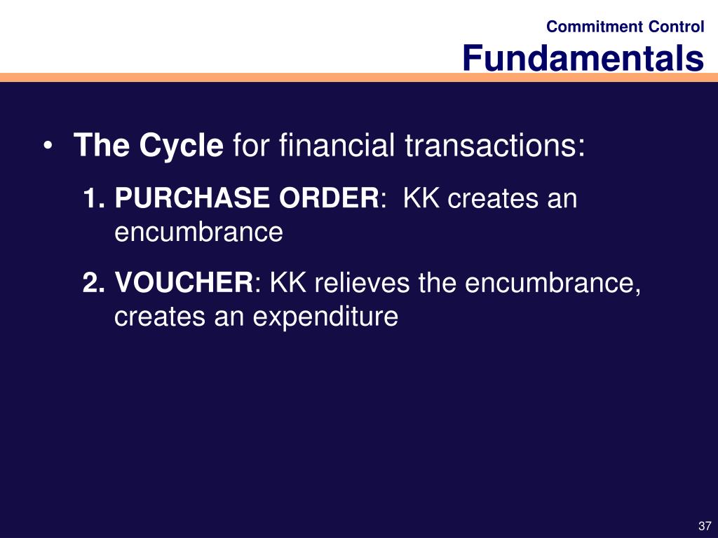 Commitment ControlFundamentals • The Cycle for financial transactions: • PURCHASE ORDER: KK creates an encumbrance • VOUCHER: KK relieves the encumbrance, creates an expenditure