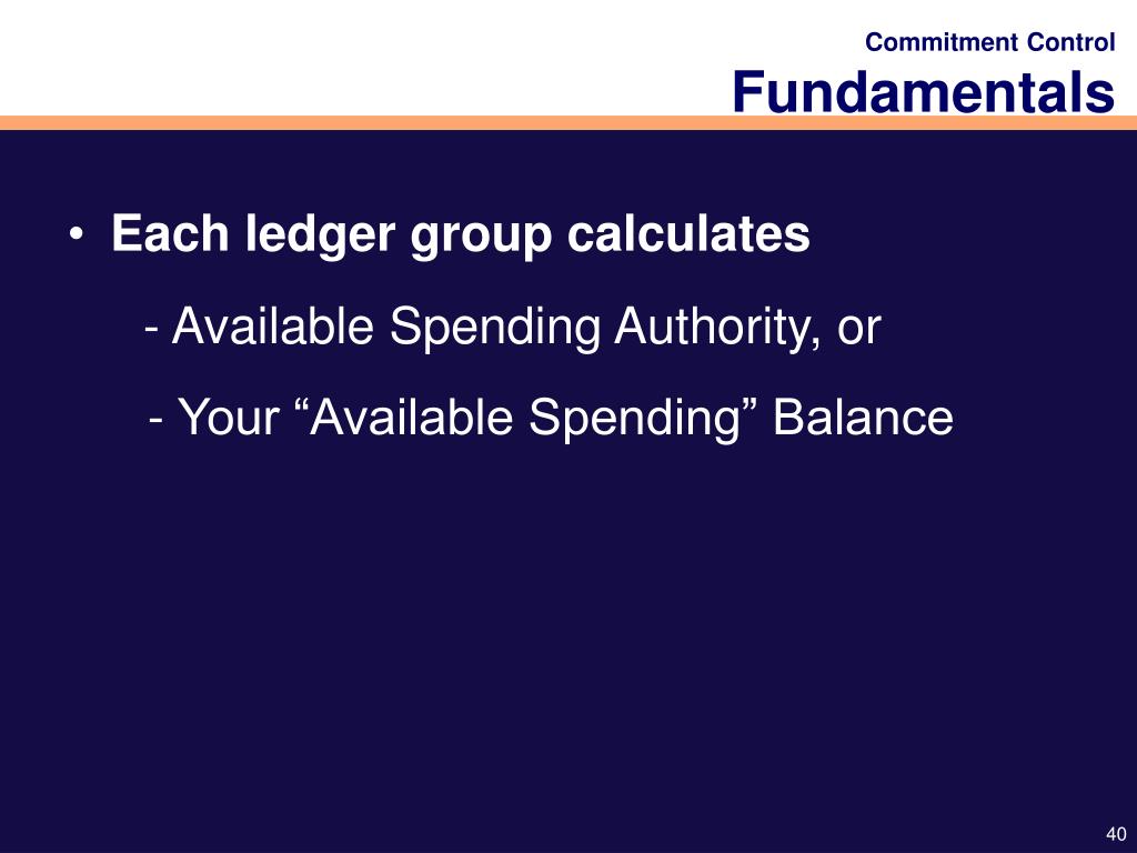 Commitment ControlFundamentals • Each ledger group calculates - Available Spending Authority, or - Your “Available Spending” Balance