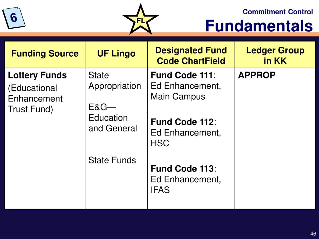 myUFL ChartFields • Fund Code Examples • 101 E&G Gen Rev, Main Campus • 102 E&G Gen Rev, HSC • 103 E&G Gen Rev, IFAS • 171 Transfer from Component Units • 201 C&G Federal Restricted • 209 C&G Other Restricted