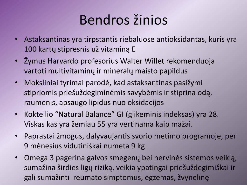 Bendros žinios Astaksantinas yra tirpstantis riebaluose antioksidantas, kuris yra 100 kartų stipresnis už vitaminą E Žymus Harvardo profesorius Walter Willet rekomenduoja vartoti multivitaminų ir mineralų maisto papildus Moksliniai tyrimai parodė, kad astaksantinas pasižymi stipriomis priešuždegiminėmis savybėmis ir stiprina odą, raumenis, apsaugo lipidus nuo oksidacijos Kokteilio “Natural Balance” GI (glikeminis indeksas) yra 28. Viskas kas yra žemiau 55 yra vertinama kaip mažai. Paprastai žmogus, dalyvaujantis svorio metimo programoje, per 9 mėnesius vidutiniškai numeta 9 kg Omega 3 pagerina galvos smegenų bei nervinės sistemos veiklą, sumažina širdies ligų riziką, veikia ypatingai priešuždegimiškai ir gali sumažinti reumato simptomus, egzemas, žvynelinę