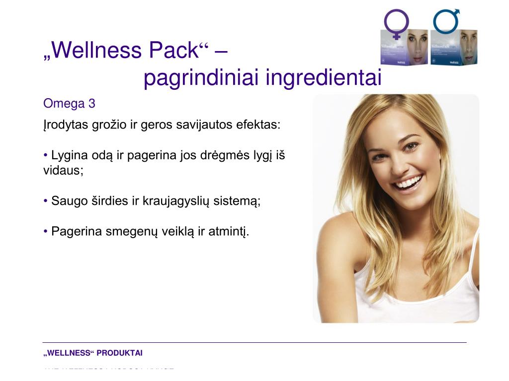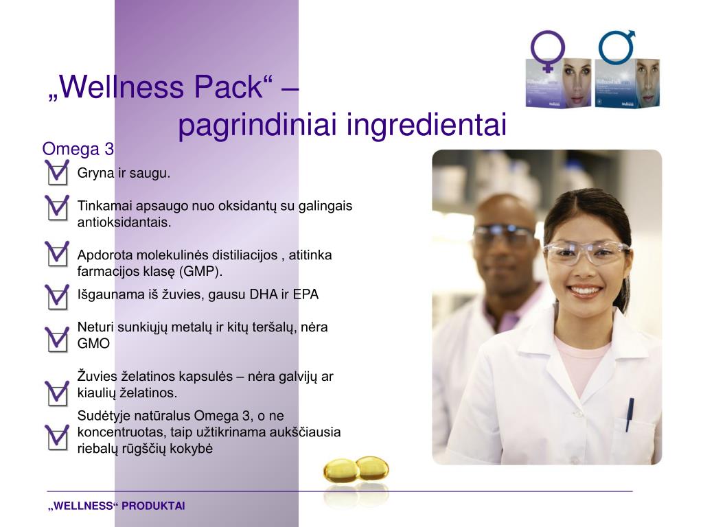 „WellnessPack“ – pagrindiniai ingredientai Omega 3 Gryna ir saugu.Tinkamai apsaugo nuo oksidantų su galingais antioksidantais.Apdorota molekulinės distiliacijos , atitinka farmacijos klasę (GMP). Išgaunama iš žuvies, gausu DHA ir EPANeturi sunkiųjų metalų ir kitų teršalų, nėra GMOŽuvies želatinos kapsulės – nėra galvijų ar kiaulių želatinos. Sudėtyje natūralus Omega 3, o ne koncentruotas, taip užtikrinama aukščiausia riebalų rūgščių kokybė „WELLNESS“ PRODUKTAI
