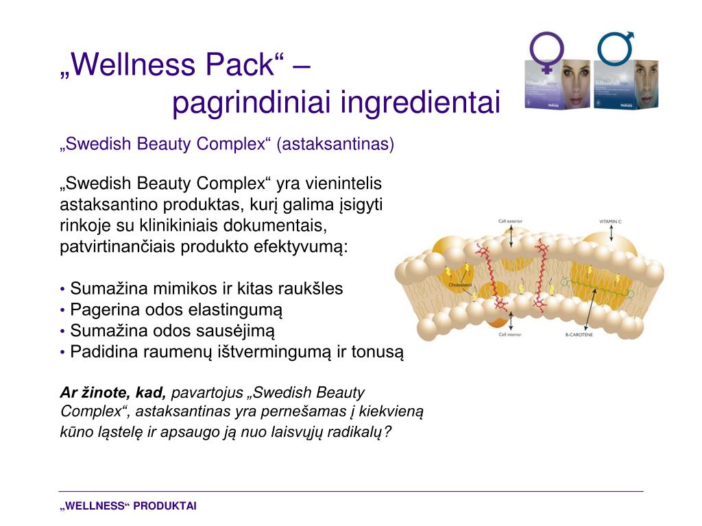 WellnessPack – Key ingredients „WellnessPack“ – pagrindiniai ingredientai Swedish Beauty Complex (Astaxanthin) „Swedish Beauty Complex“ (astaksantinas) Swedish Beauty Complex is the only source of astaxanthin available on the market with clinically- documented beauty and performance effects: •Reduces fine lines and wrinkles •Improves skin elasticity • Reduces skin dryness • Increases muscle performance and endurance Did you know that after taking the Swedish Beauty Complex, astaxanthin is transported to every cell in your body to protect them against free radicals? „Swedish Beauty Complex“yra vienintelis astaksantino produktas, kurį galima įsigyti rinkoje su klinikiniais dokumentais, patvirtinančiais produkto efektyvumą: •Sumažina mimikos ir kitas raukšles •Pagerina odos elastingumą •Sumažina odos sausėjimą •Padidina raumenų ištvermingumą ir tonusą Ar žinote, kad,pavartojus„Swedish Beauty Complex“, astaksantinas yra pernešamas į kiekvieną kūno ląstelę ir apsaugo ją nuo laisvųjų radikalų? THE WELLNESSPRODUCT RANGE „WELLNESS“ PRODUKTAI