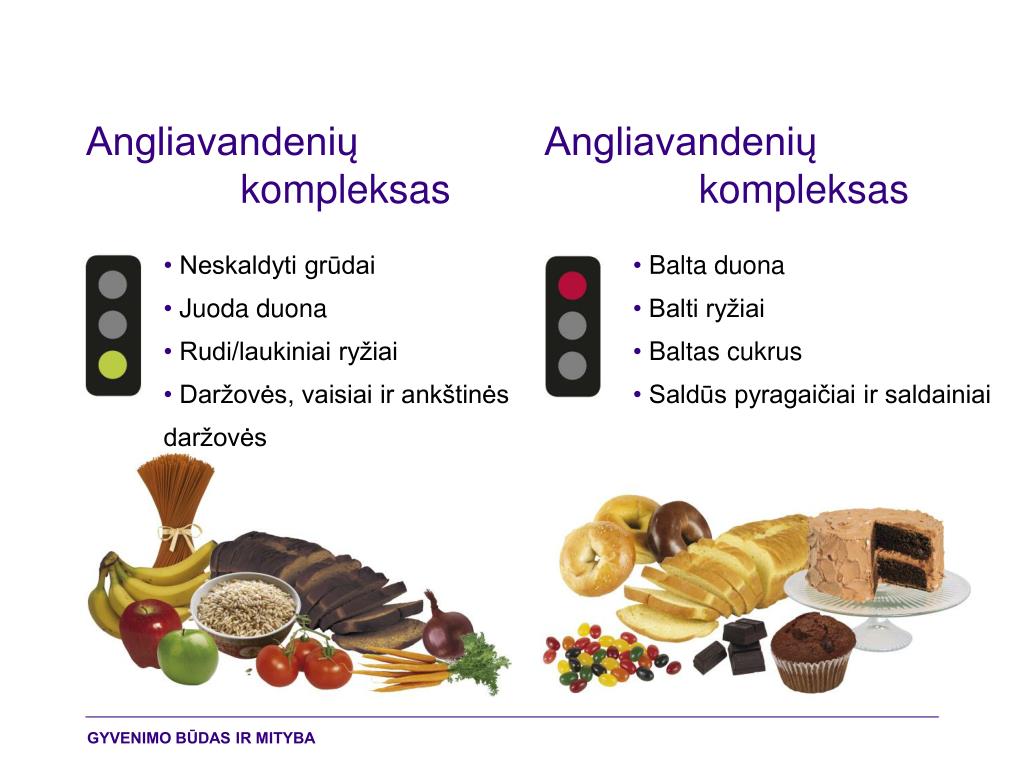 Angliavandenių kompleksas Angliavandenių kompleksas •Neskaldyti grūdai •Juoda duona •Rudi/laukiniai ryžiai • Daržovės, vaisiai ir ankštinės daržovės •Balta duona •Balti ryžiai •Baltas cukrus •Saldūs pyragaičiai ir saldainiai GYVENIMO BŪDAS IR MITYBA