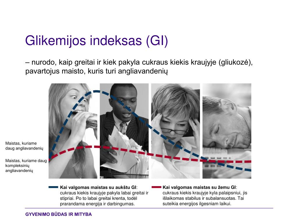 Glikemijos indeksas (GI) – nurodo, kaip greitai ir kiek pakyla cukraus kiekis kraujyje (gliukozė), pavartojus maisto, kuris turi angliavandenių Maistas, kuriame daug angliavandenių Maistas, kuriame daug kompleksinių angliavandenių Kai valgomas maistas su žemu GI: cukraus kiekis kraujyje kyla palaipsniui, jis išlaikomas stabilus ir subalansuotas. Tai suteikia energijos ilgesniam laikui. Kai valgomas maistas su aukštu GI: cukraus kiekis kraujyje pakyla labai greitai ir stipriai. Po to labai greitai krenta, todėl prarandama energija ir darbingumas. GYVENIMO BŪDAS IR MITYBA