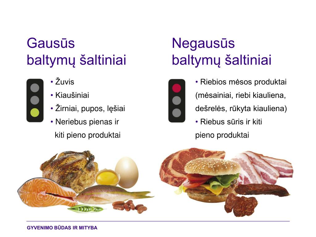 Gausūsbaltymų šaltiniai Negausūs baltymų šaltiniai •Žuvis •Kiaušiniai •Žirniai, pupos, lęšiai • Neriebus pienas ir kiti pieno produktai •Riebios mėsos produktai (mėsainiai, riebi kiauliena, dešrelės, rūkyta kiauliena) •Riebus sūris ir kiti pieno produktai GYVENIMO BŪDAS IR MITYBA