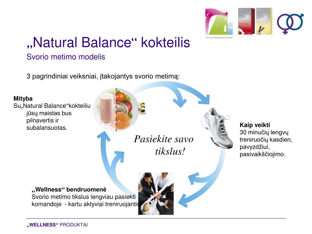 „Natural Balance“kokteilis Svorio metimo modelis 3 pagrindiniai veiksniai, įtakojantys svorio metimą: Mityba Su„Natural Balance“kokteiliu jūsų maistas bus pilnavertis ir subalansuotas. Kaip veikti 30 minučių lengvų treniruočių kasdien, pavyzdžiui, pasivaikščiojimo. Pasiekite savo tikslus! „Wellness“bendruomenė Svorio metimo tikslus lengviau pasiekti komandoje - kartu aktyviai treniruojantis. „WELLNESS“PRODUKTAI