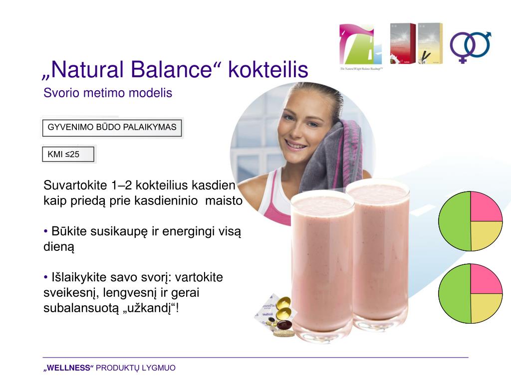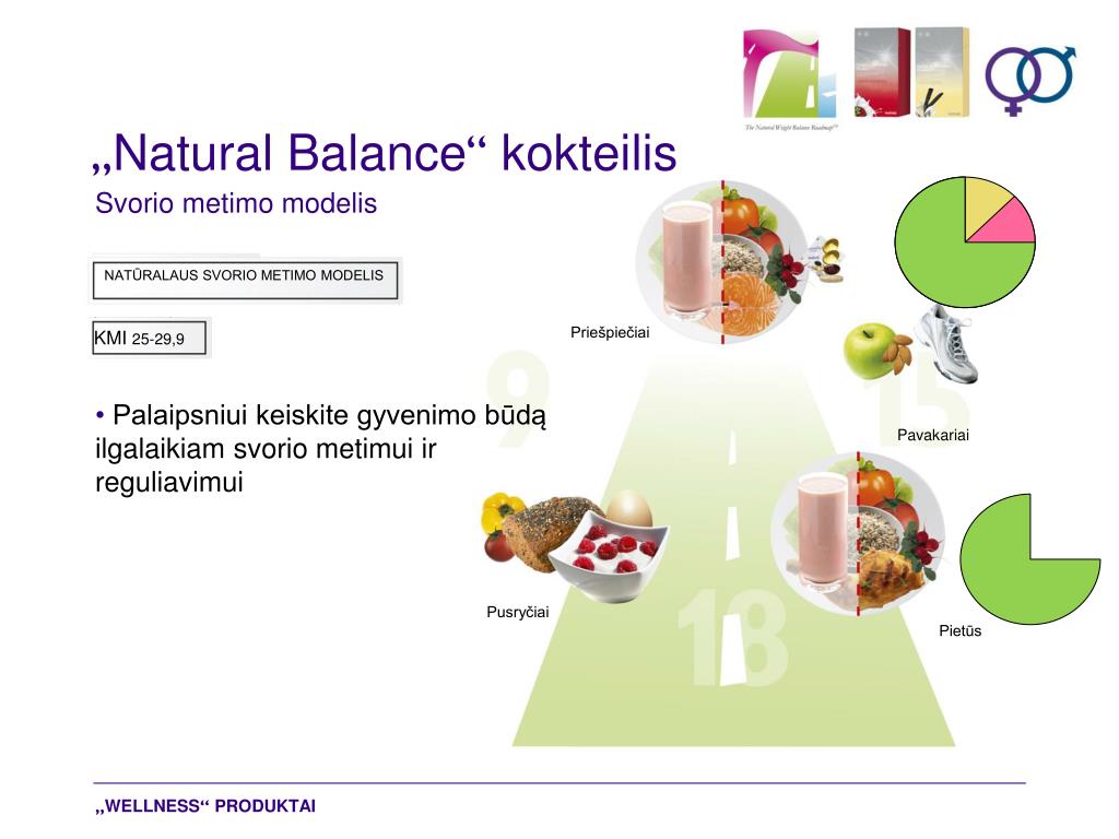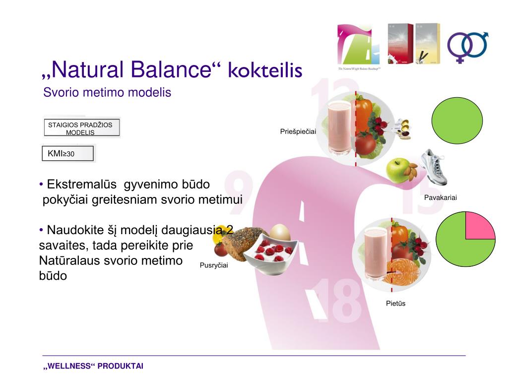 „Natural Balance“kokteilis Svorio metimo modelis NATŪRALAUS SVORIO METIMO MODELIS Priešpiečiai KMI 25-29,9 •Palaipsniui keiskite gyvenimo būdą ilgalaikiam svorio metimui ir reguliavimui Pavakariai Pusryčiai Pietūs „WELLNESS“PRODUKTAI