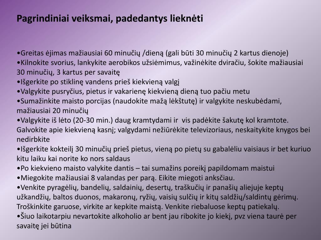 Pagrindiniai veiksmai, padedantys lieknėti • Greitas ėjimas mažiausiai 60 minučių /dieną (gali būti 30 minučių 2 kartus dienoje) • Kilnokite svorius, lankykite aerobikos užsiėmimus, važinėkite dviračiu, šokite mažiausiai 30 minučių, 3 kartus per savaitę • Išgerkite po stiklinę vandens prieš kiekvieną valgį • Valgykite pusryčius, pietus ir vakarienę kiekvieną dieną tuo pačiu metu • Sumažinkite maisto porcijas (naudokite mažą lėkštutę) ir valgykite neskubėdami, mažiausiai 20 minučių • Valgykite iš lėto (20-30 min.) daug kramtydami ir vis padėkite šakutę kol kramtote. Galvokite apie kiekvieną kasnį; valgydami nežiūrėkite televizoriaus, neskaitykite knygos bei nedirbkite • Išgerkite kokteilį 30 minučių prieš pietus, vieną po pietų su gabalėliu vaisiaus ir bet kuriuo kitu laiku kai norite ko nors saldaus • Po kiekvieno maisto valykite dantis – tai sumažins poreikį papildomam maistui • Miegokite mažiausiai 8 valandas per parą. Eikite miegoti anksčiau. • Venkite pyragėlių, bandelių, saldainių, desertų, traškučių ir panašių aliejuje keptų užkandžių, baltos duonos, makaronų, ryžių, vaisių sulčių ir kitų saldžių/saldintų gėrimų. Troškinkite garuose, virkite ar kepkite maistą. Venkite riebaluose keptų patiekalų. • Šiuo laikotarpiu nevartokite alkoholio ar bent jau ribokite jo kiekį, pvz viena taurė per savaitę jei būtina